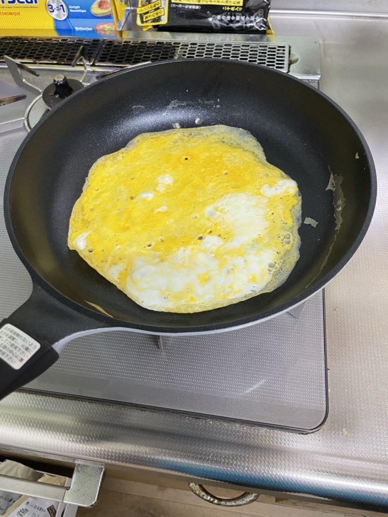 フライパンの淵についているカスのようなものは先に焼いた錦糸卵の残りです