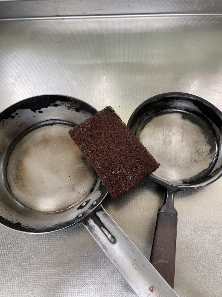 使用後は中央に乗っている”ガンコタワシ”で力を込めてゴシゴシと擦って洗った後油を引いて片付けていました